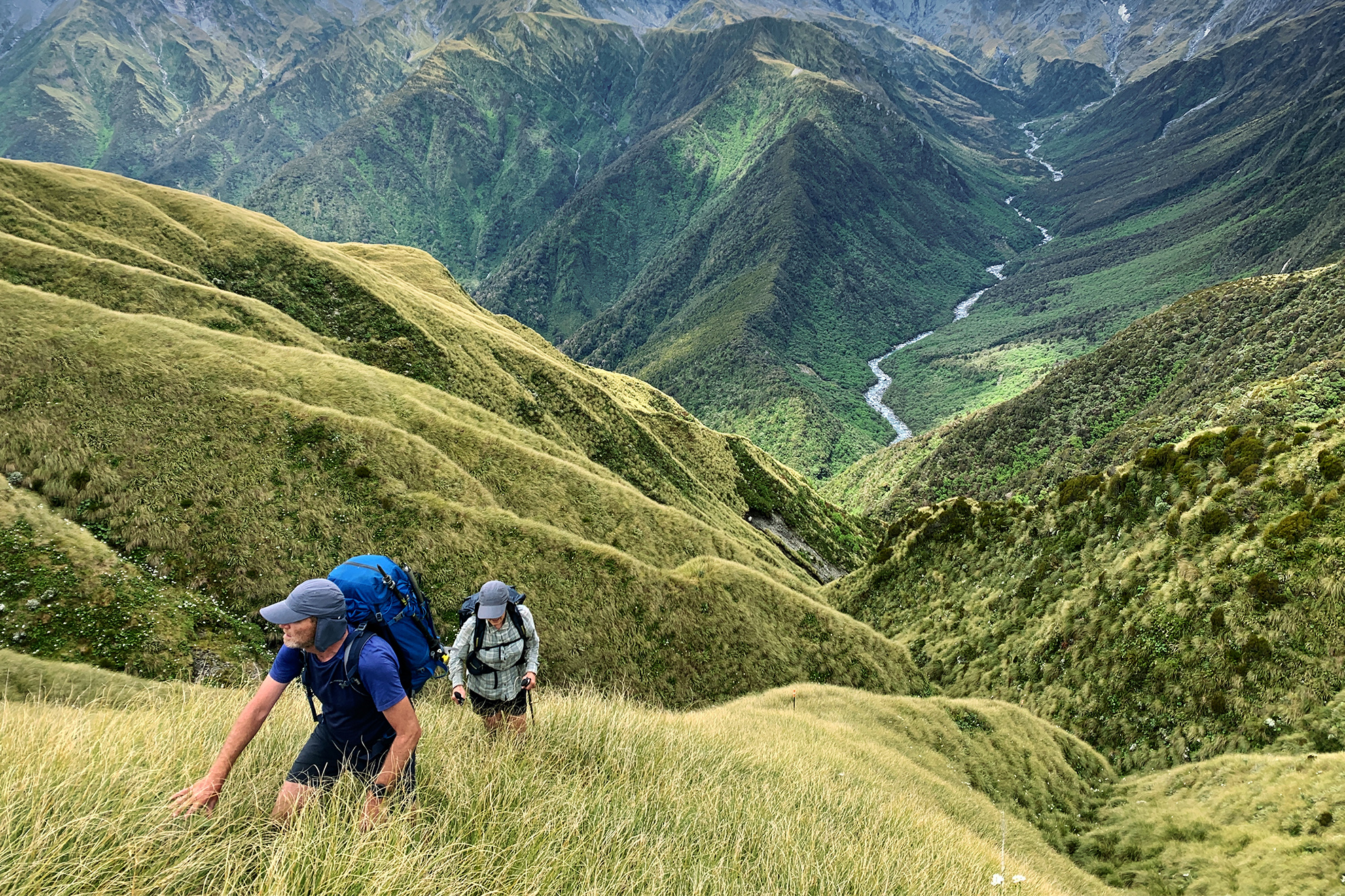 It was a slippery slither to the swingbridge across the Morgan Gorge and our first view of the Waitaha in power mode. The water below, cornflower blue and opaque with snowmelt, roared and foamed through buttresses of polished schist. It was not to be taken lightly.