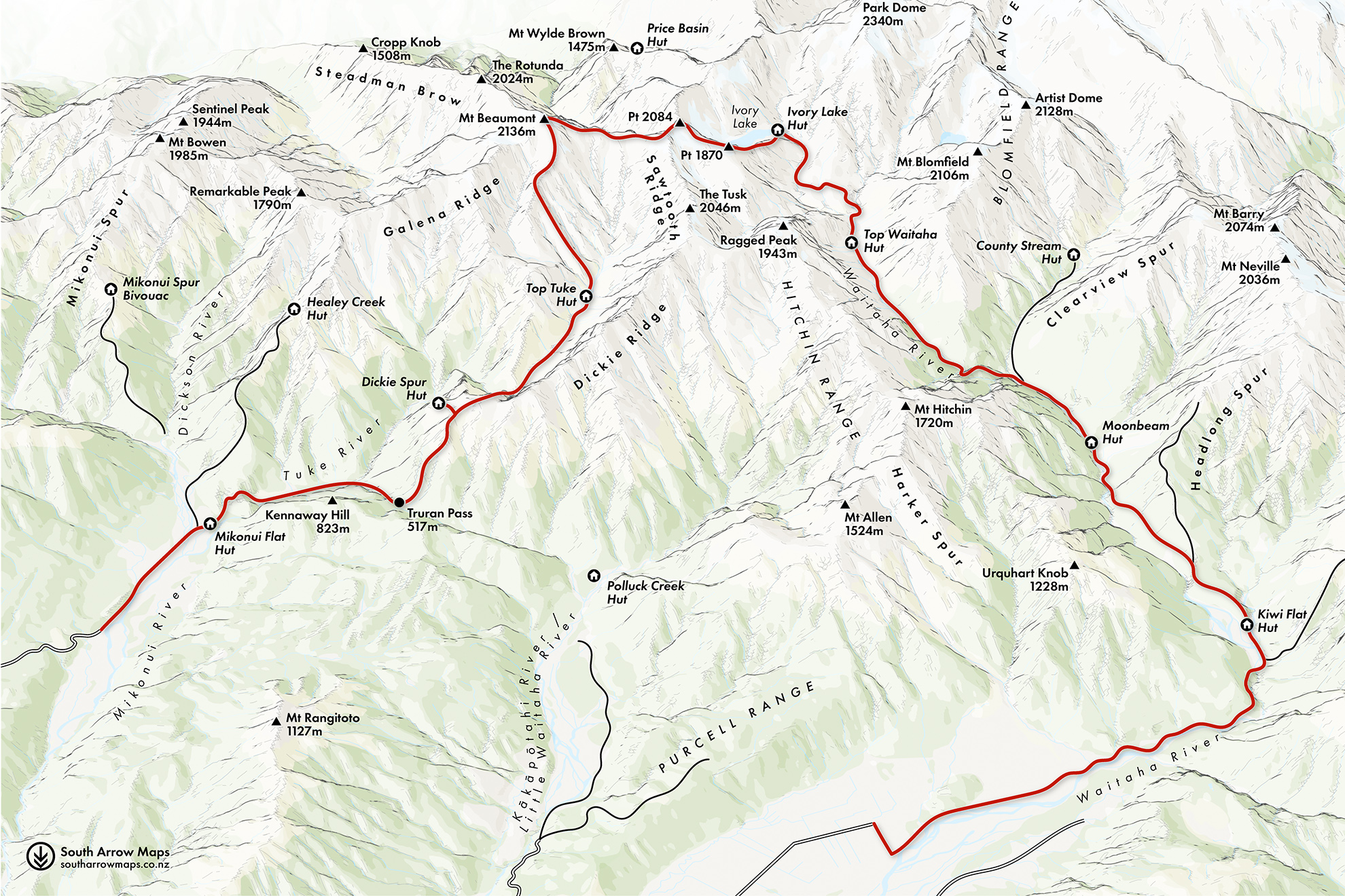 There are many routes to Ivory Lake Hut – via the Steadman Brow, Prices Flat from the Whitcombe or the spiky Galaena Ridge – but none of these routes has the fearsome reputation of the Waitaha River. Hut log books along the route are littered with tales of despair.