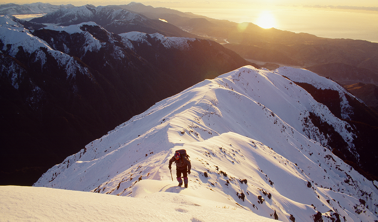 Mt Arthur is a popular destination at any time of year with its stunning alpine flowers in spring, karst landscape and magnificent views, but how about trying it at dawn in winter? The summit then is a spectacular location when the fiery ball of the sun crests the horizon way out in the Nelson bays and illuminates the slopes. Keep to the poled route as there are many sink holes and rock slots that after a good snow fall will be covered. Some basic alpine skills and equipment will be required.