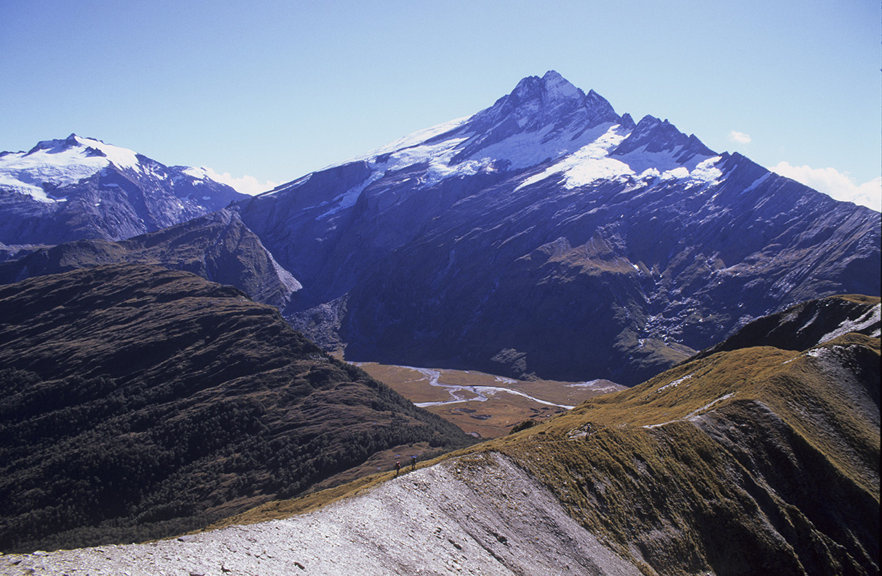 The 2600m peak is an arresting sight. Its massive triangular summit, beset by glaciers on all flanks, falls sheer to the upper Clarke Valley and our destination, Marks Flat. The flat is located in the Hooker Landsborough Wilderness Area, a great swathe of protected wild country between the Landsborough and Mahitahi rivers.