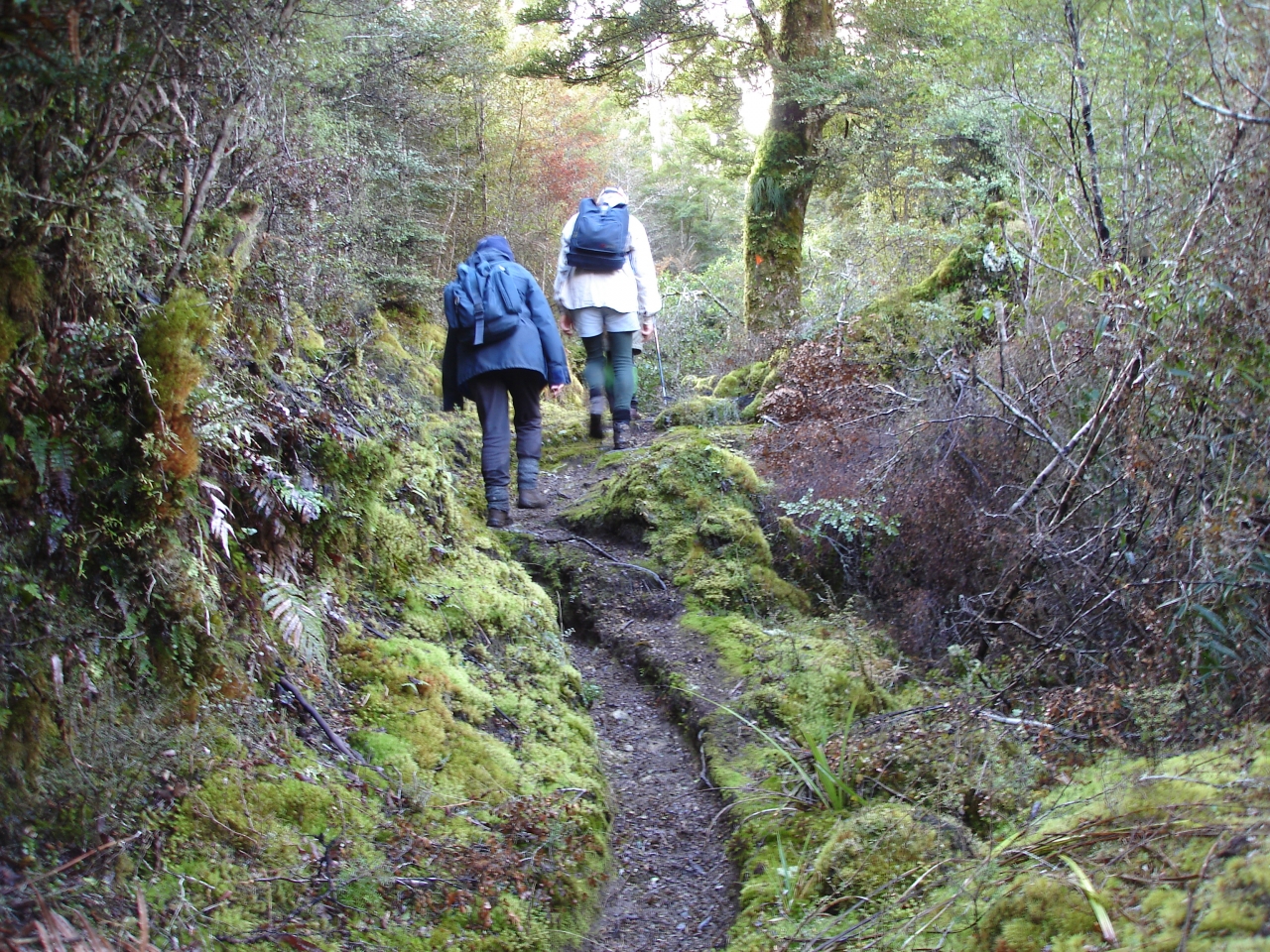 The track climbs parallel to the Hinemaiaia Stream, but the going soon gets a bit rougher with a steep unprotected drop and several short, steep slopes where tree roots need to be used as ladders.