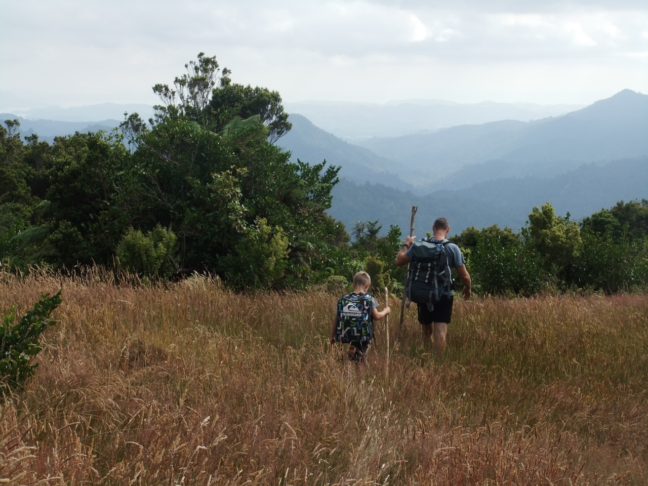 After this point the track changes into a tramping track, it climbs steeply and there are many tree roots to be negotiated. The kauri trees merge into a mixed native forest with hard beech, opodocarp, ferns, nikau, vines and epiphytes. It’s overgrown, with lots of fallen trees. Past the main range junction at 690m the going gets easier and you emerge from the forest as you walk through Crosbies Settlement, the site of a farm from 1880 to the 1970s.