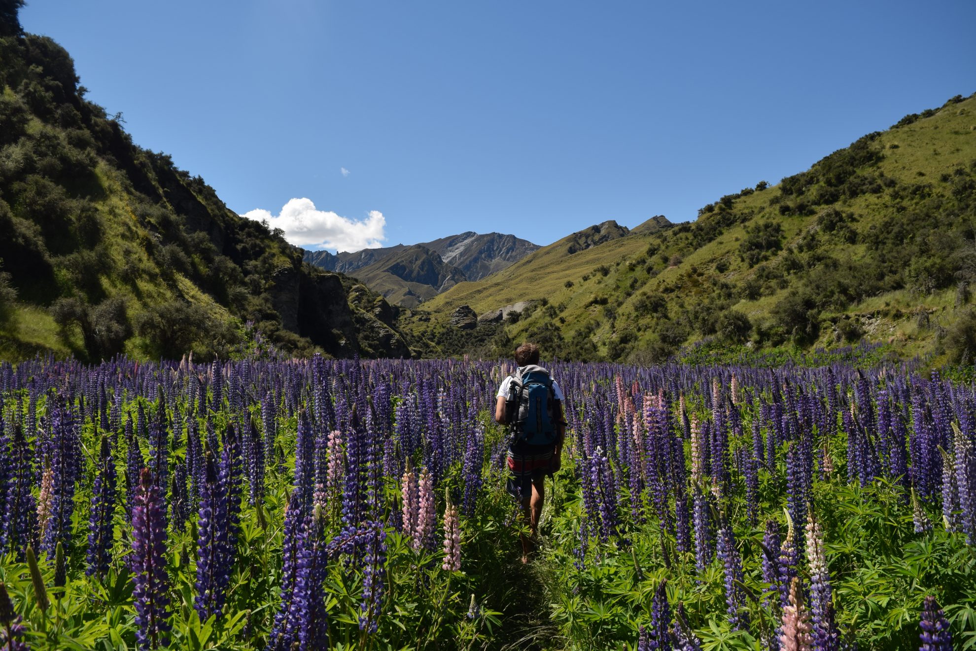 The track follows the stream bed for about two hours, winding through a deep gorge with crumbly schist cliffs rising from the streambed. The valley widens in places and thousands of lupins and wild mint grow on the gravelly riverbank.