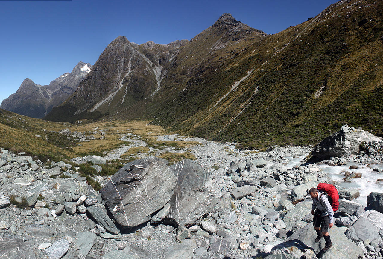 Follow the Rockburn Track up valley, across the plains and to Theatre Flat where you might camp for the night.