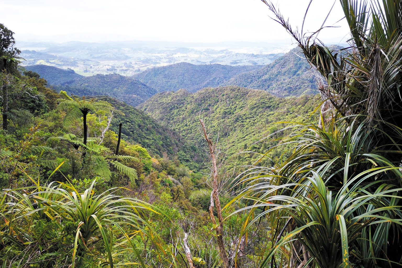 After around 30min, there are glimpses of Hokianga Harbour. A short, steep, scramble up a bank reveals more views before the track plunges into a valley filled with lush, green subtropical forest.