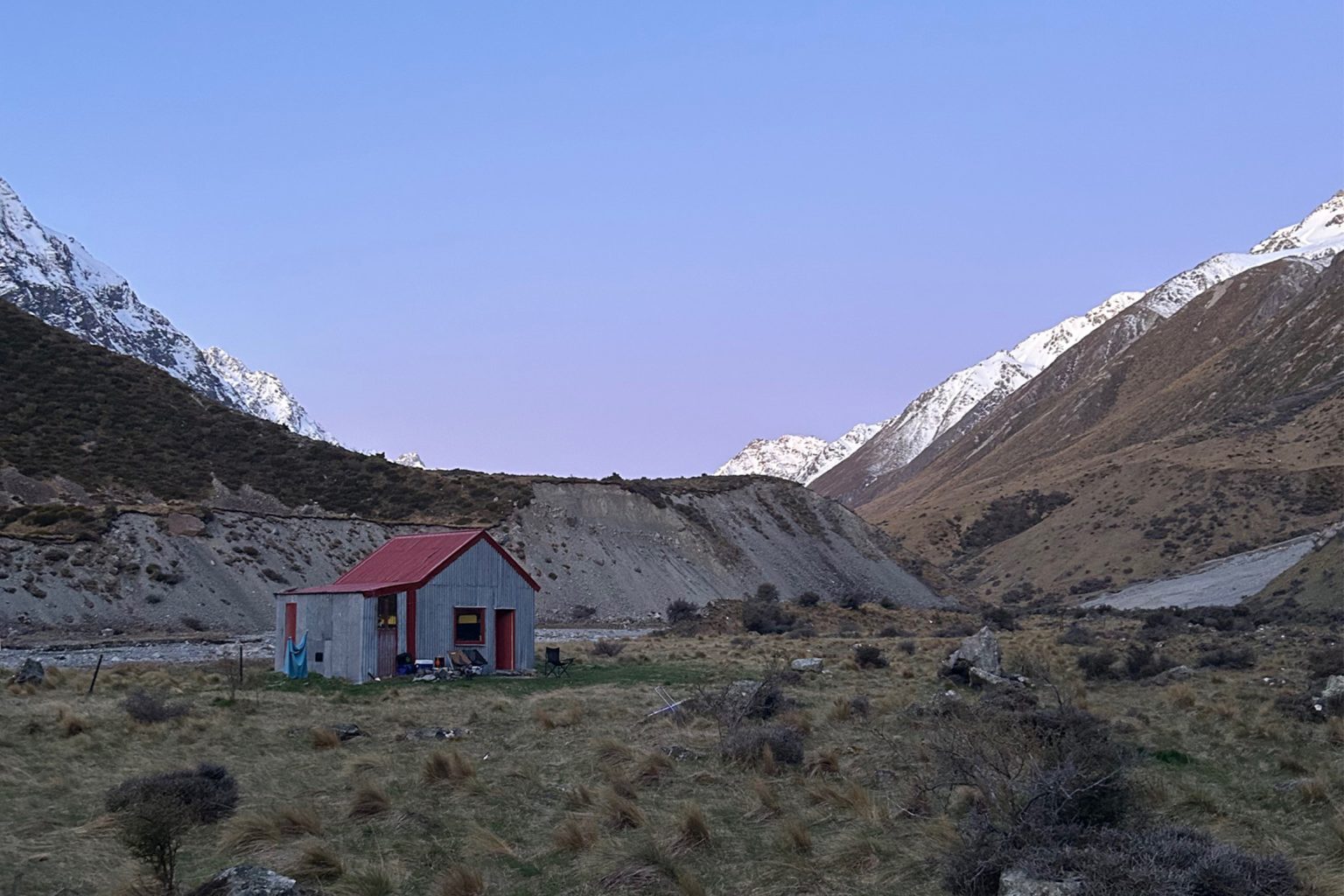 The valley begins to narrow about 1km before the hut, signifying its proximity. A worn ground trail leads up a tussock slope to an active slip, but it is easier to trace around the terrace below the slip than cross it.