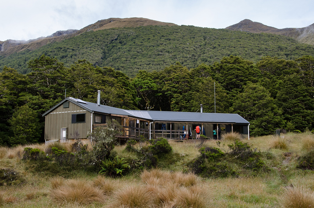 The 20-bunk Greenstone Hut lies on the edge of a wide clearing, offering stunning views to the south-east.