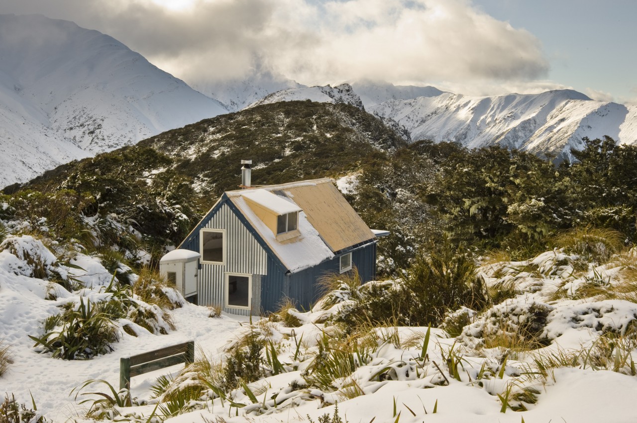 Howletts lies right on the bush-edge; an attractive combination of orange and blue, with a steep gabled ridge and an effective potbelly stove inside. Grand views expand eastwards to Hawke’s Bay, but the best view is further along the ridge, where the Sawtooth Ridge appears in sharp profile. It’s a serrated bit of real estate in summer, but winter snow and ice lend it a grandeur as impressive as parts of the Southern Alps.