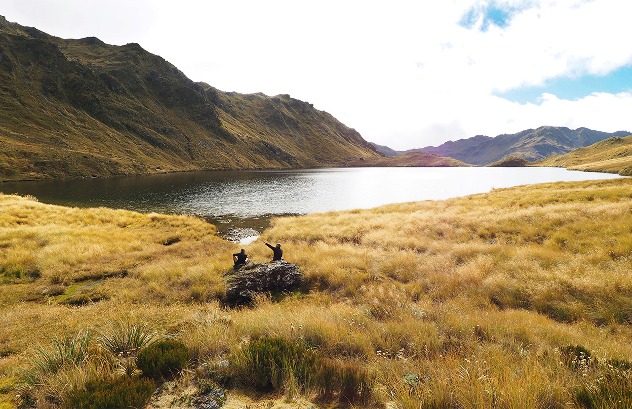 Lake Morgan came into view, nestled in a cirque of hills and snowgrass. We had a good look around and then descended from near to the lake’s outlet and through a group of tarns to Lake Morgan Hut, another cosy six bunker. Reading the hut book, which dates back to 1982, we found this part of the Morgan Range has regular visitors, unlike the Cone Creek area.