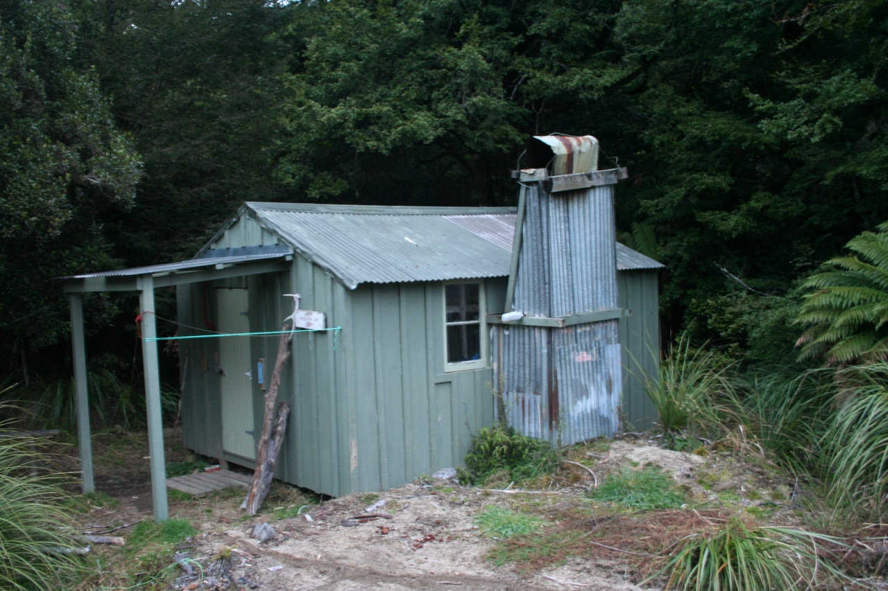 The hut, a standard Forest Service six bunker, stands at the downstream end of a large flat with a pleasant northerly aspect.