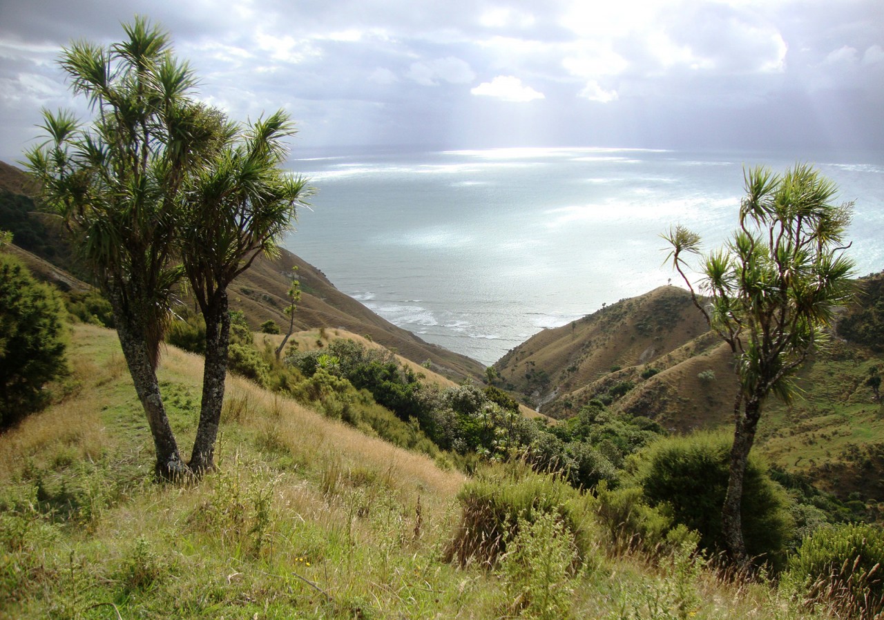 Approximately two thirds of the way along, there’s a clearing with a picnic table surrounded by a rich nikau stand. It’s a peaceful spot to relax before commencing the final ascent back to the gate. After leaving the reserve, consider staying on Kinikini Road and continuing towards Long Point, formerly known for its nearby whaling station. The road offers numerous outlooks over the dramatic slopes descending to the sea.