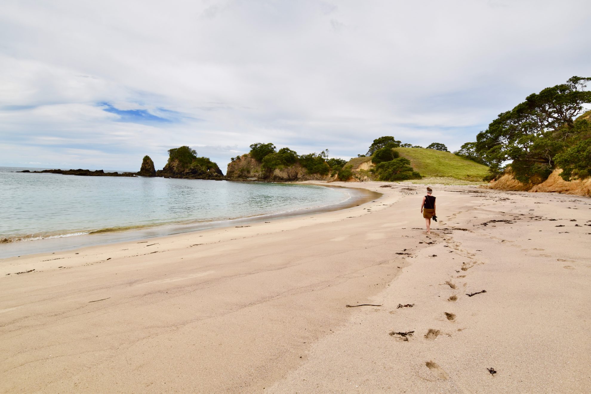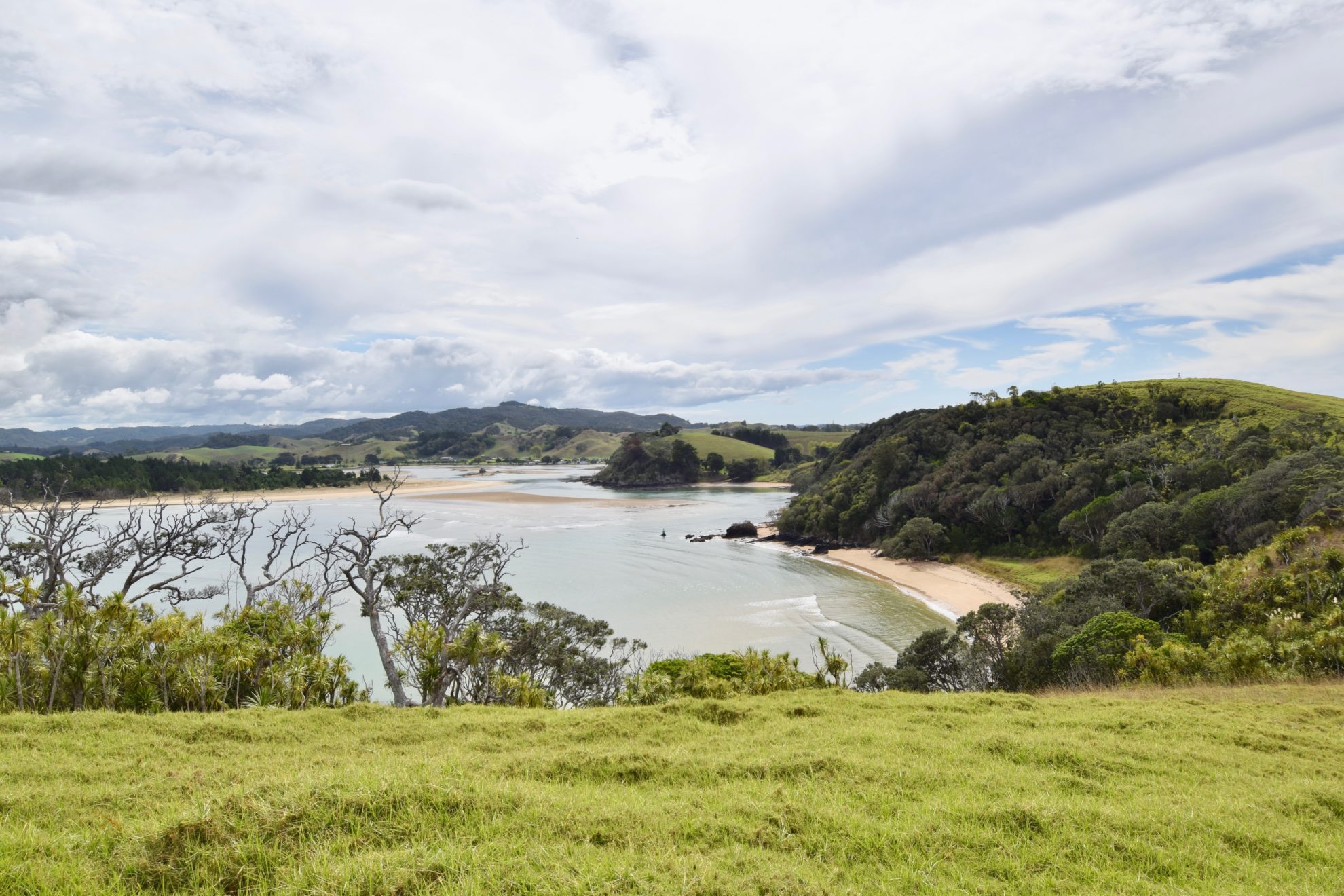 From here it continues through farmland, climbing steeply with views of the white sand Kings Beach below and out to the Poor Knights Islands on the horizon.