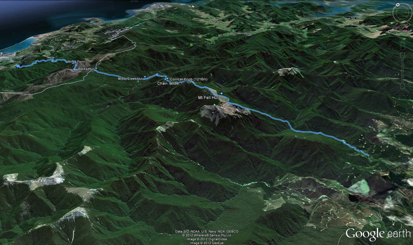 From Rocks Hut excellent views of the ridge leading to Mt Fell can be had. It shows a series of climbs over ever-higher peaks. Conical Knob rises 1216m above the Pelorus and beyond is an unnamed 1496m peak so steep it has three fixed wires to help people climb it.