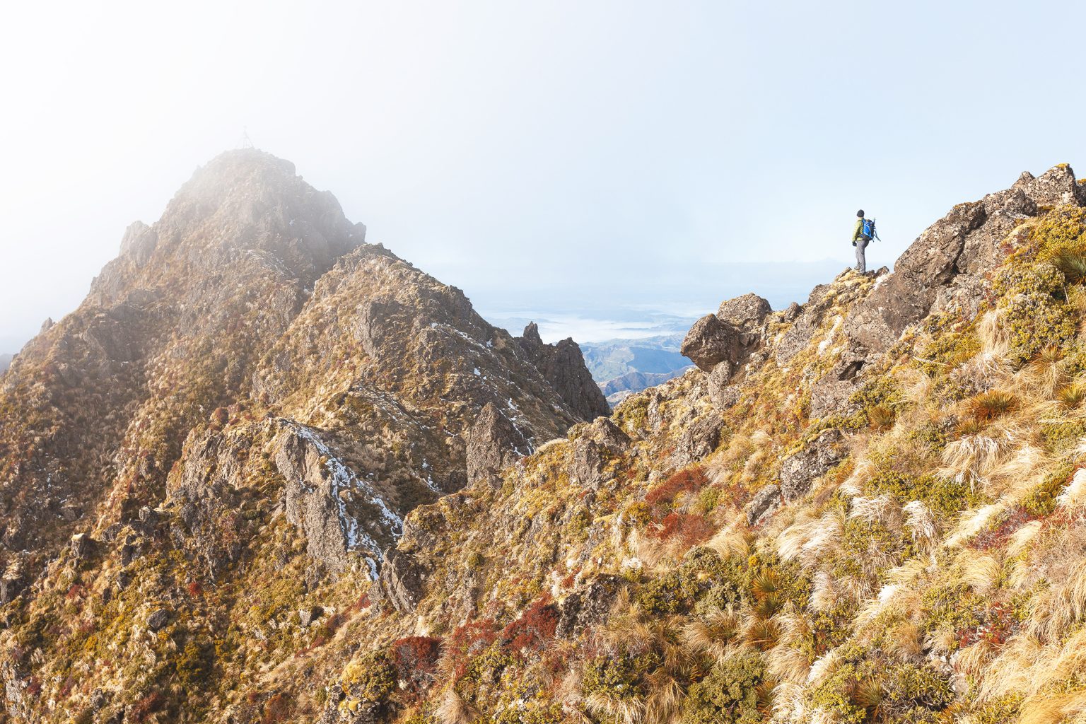 At 1540m the route enters a steep scree gully and ascends 150m to a col between Hikurangi’s twin summits. During the colder months this shady southwest-facing gully can be icy or snow covered, requiring extra caution and sometimes ice axe and crampons. The lower northern peak is a short scramble from the col and is a perfect spot to absorb remarkable views of the surrounding landscape and out to the Pacific.