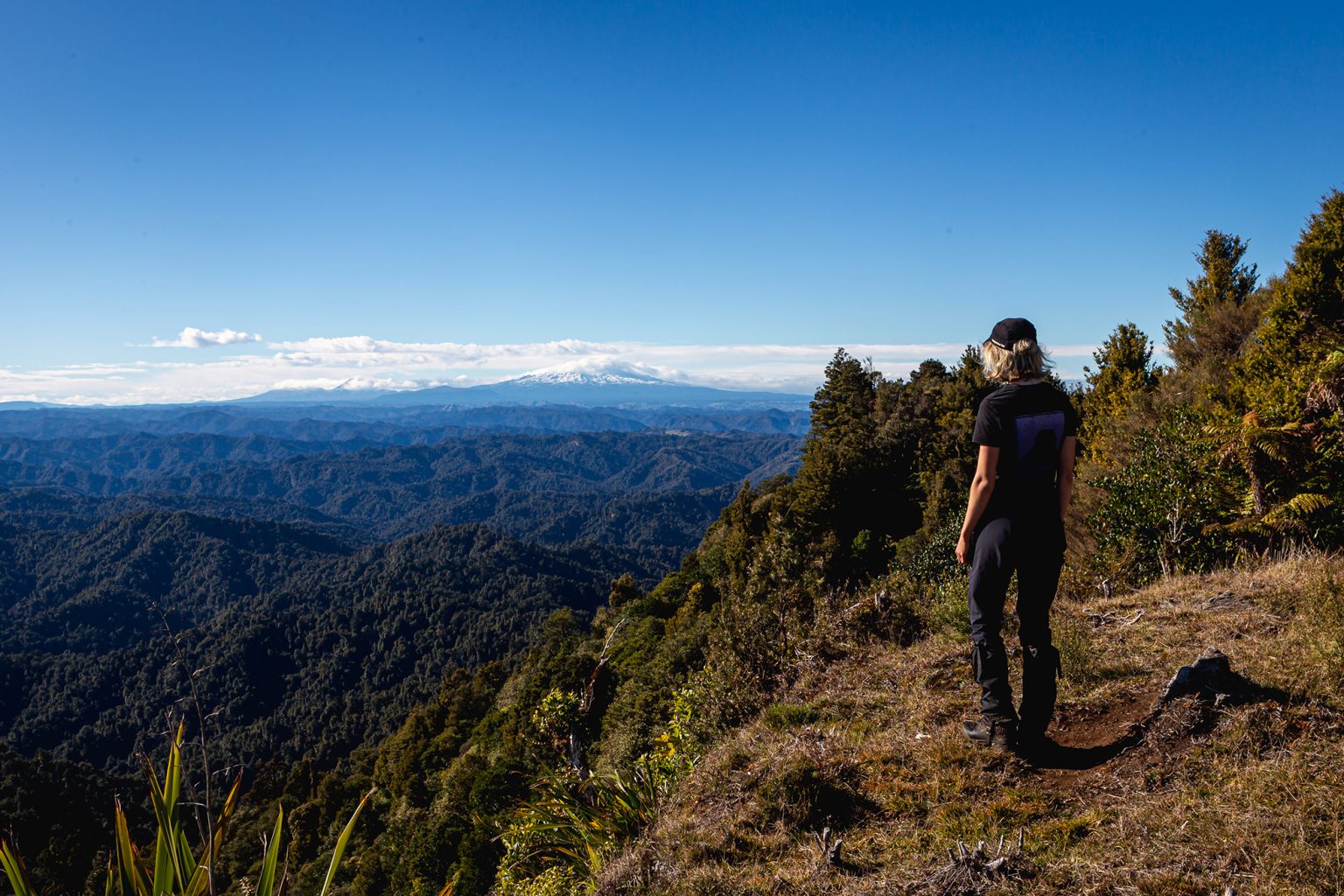 A great addition to this trip is a walk to the trig on Whakaihuwaka Mt Humphries (732m). Whakaihuwaka towers over the surrounding hill country and offers panoramic views to Taranaki in the west, Mt Hikurangi in the north and the volcanic Central Plateau in the east. The route to Whakaihuwaka begins behind Ōmaru Hut, continuing along the Matemateāonga Track as it follows the ridgeline. After about an hour (5km) the track leaves the ridge and traverses the northeastern flank of Whakaihuwaka. Bridges span small streams and Ruapehu can be glimpsed between ponga. After around 30min (2.5km) the turn-off for the Whakaihuwaka summit track is reached. Unlike the flat Matemateāonga Track, this ascends steeply through bush for 150m and passes an impressive limestone cliff studded with fossils. The track then undulates for 700m along the top of Whakaihuwaka before reaching a grassy clearing next to the trig.