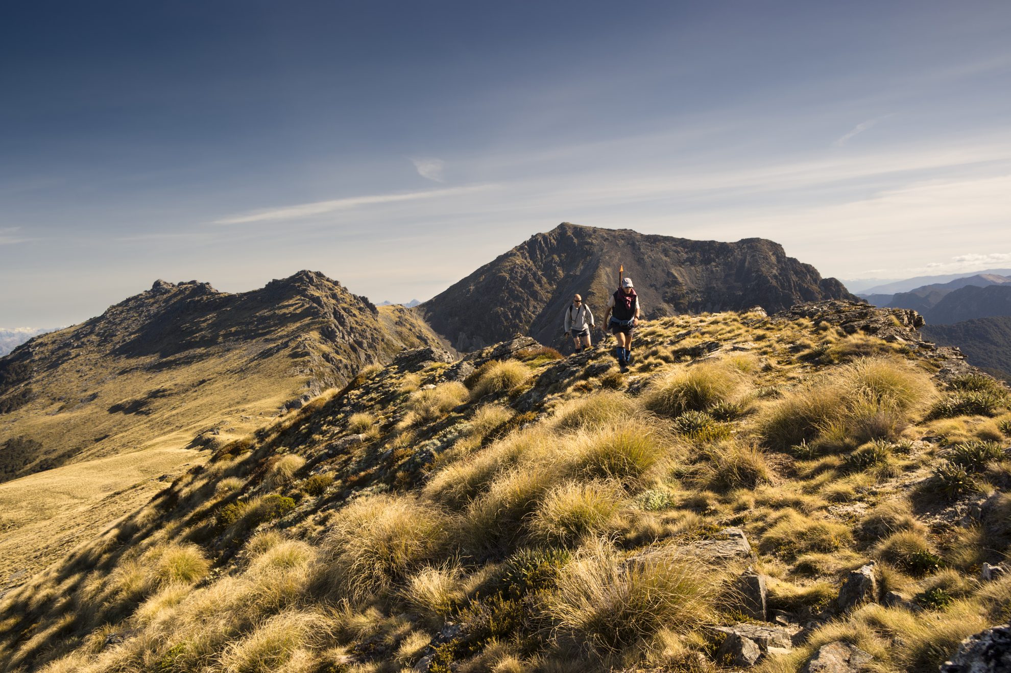 A short, sharp descent of the east ridge, over jumbled rocks and patches of scree, leads to a high tussock plateau. Weave through rocky ramparts to gain the saddle with Johnston Peak. (Leave packs here if you wish to bag Johnston Peak. Allow an hour for the return journey.)