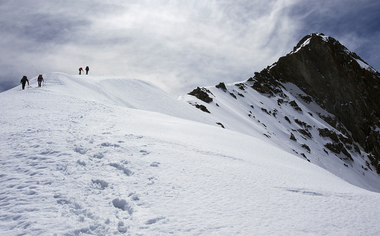 At the first snowy slope, crampons and ice axes will be needed for the zigzag up the 30-degree slope.
