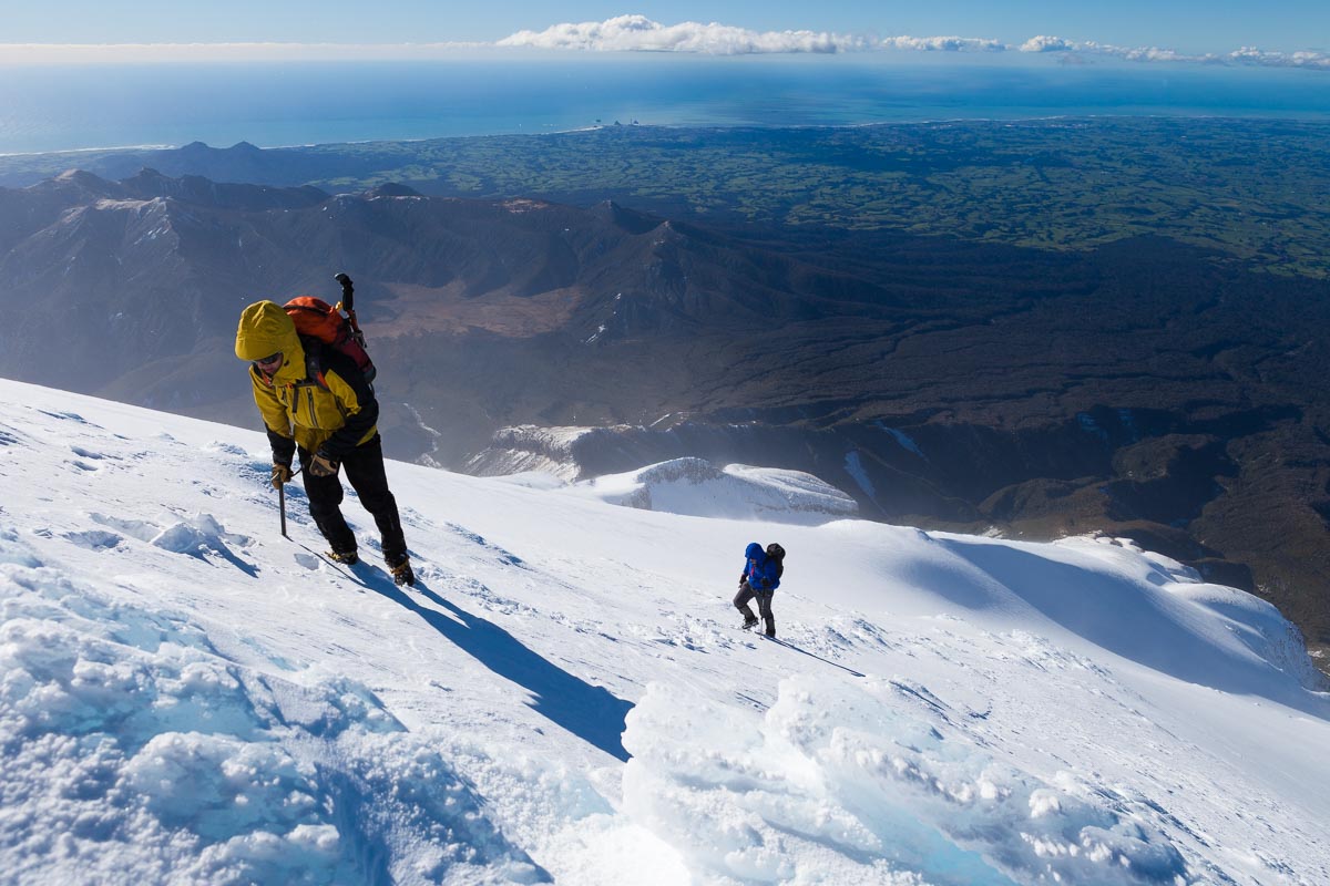 In winter, regardless of which route you take to the summit, climbing Taranaki demands at least the use of crampons and an axe.