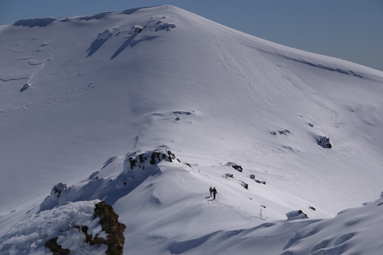 The view from Mt Tongariro in winter is absolutely stunning. Nearby Ngauruhoe and distant Ruapehu offer a sense of scale in a seemingly vast landscape, otherwise devoid of features thanks to a pure white blanket covering everything.