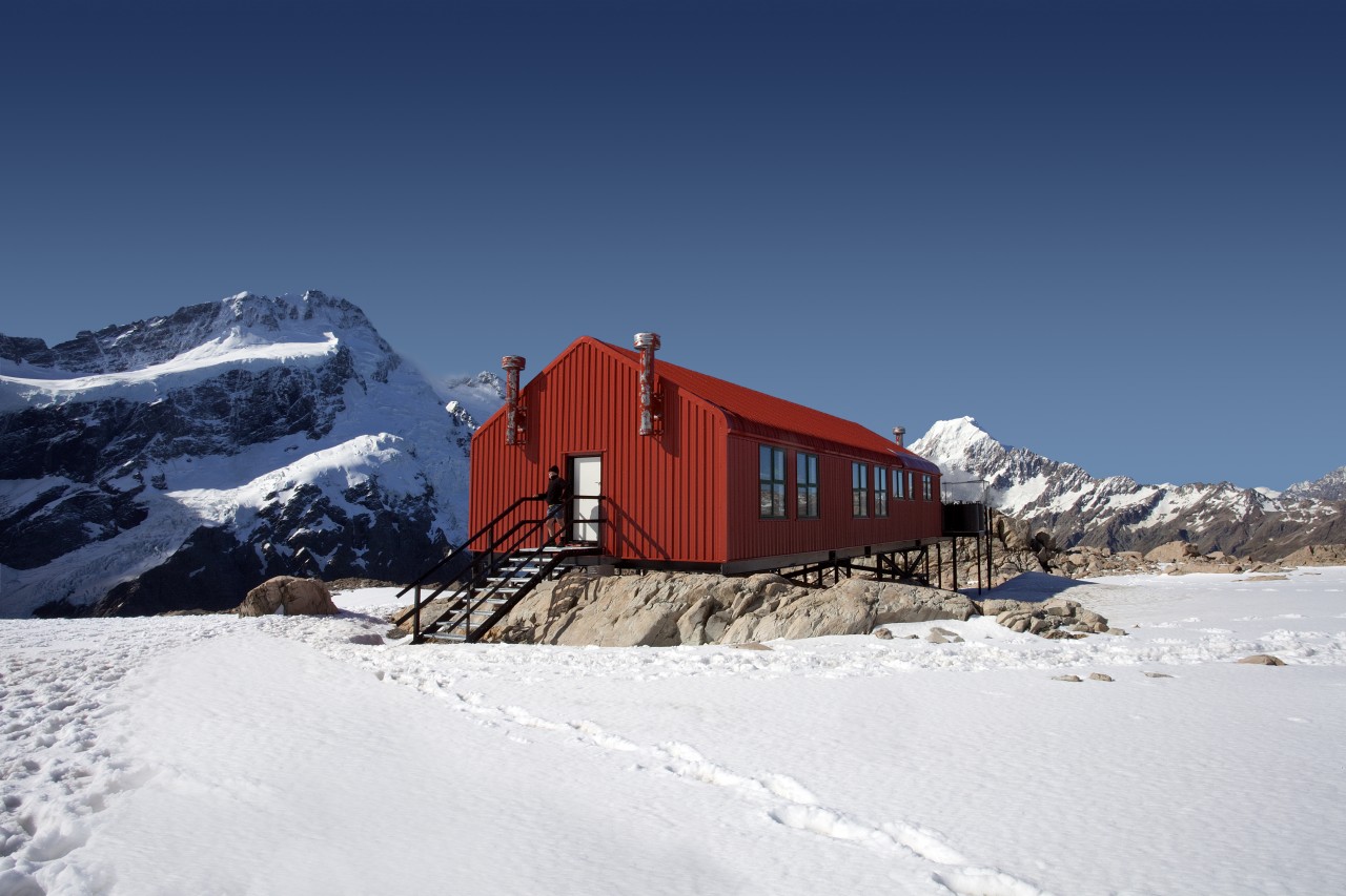 Higher up, there are no more staircases or handrails. Careful footing is required to balance movement over the large boulder field, before slogging up a tedious slope. Marker poles sidle along to the main ridgeline, then lead around to the shiny red hangar that is Mueller Hut. The current commodious hut was constructed in 2003, opened by Sir Ed Hillary himself, occupying a prime piece of real estate on a sloping snow plateau.
