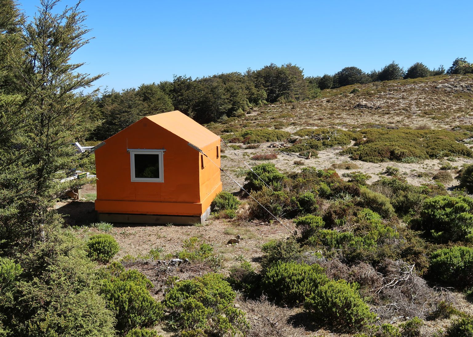 North Whetu Biv started life in 1958 as Studholme Saddle Biv and was the first hut built in Kaweka Forest Park by the NZ Forest Service. For some reason known only to the Forest Service, a four-bunk hut was later built 500m away. The biv is a classic ‘dog-box’ crawl-in two-person structure in a pleasant location on the bushline. In April 2022, with the support of DOC and the Backcountry Trust, volunteers relocated it from near Studholme Saddle to its new site, 10km north as the kākā flies, off the northern end of the Kaweka Range. A couple of years later DOC shifted four-bunk Studholme Saddle Hut half a kilometre to the old biv site.