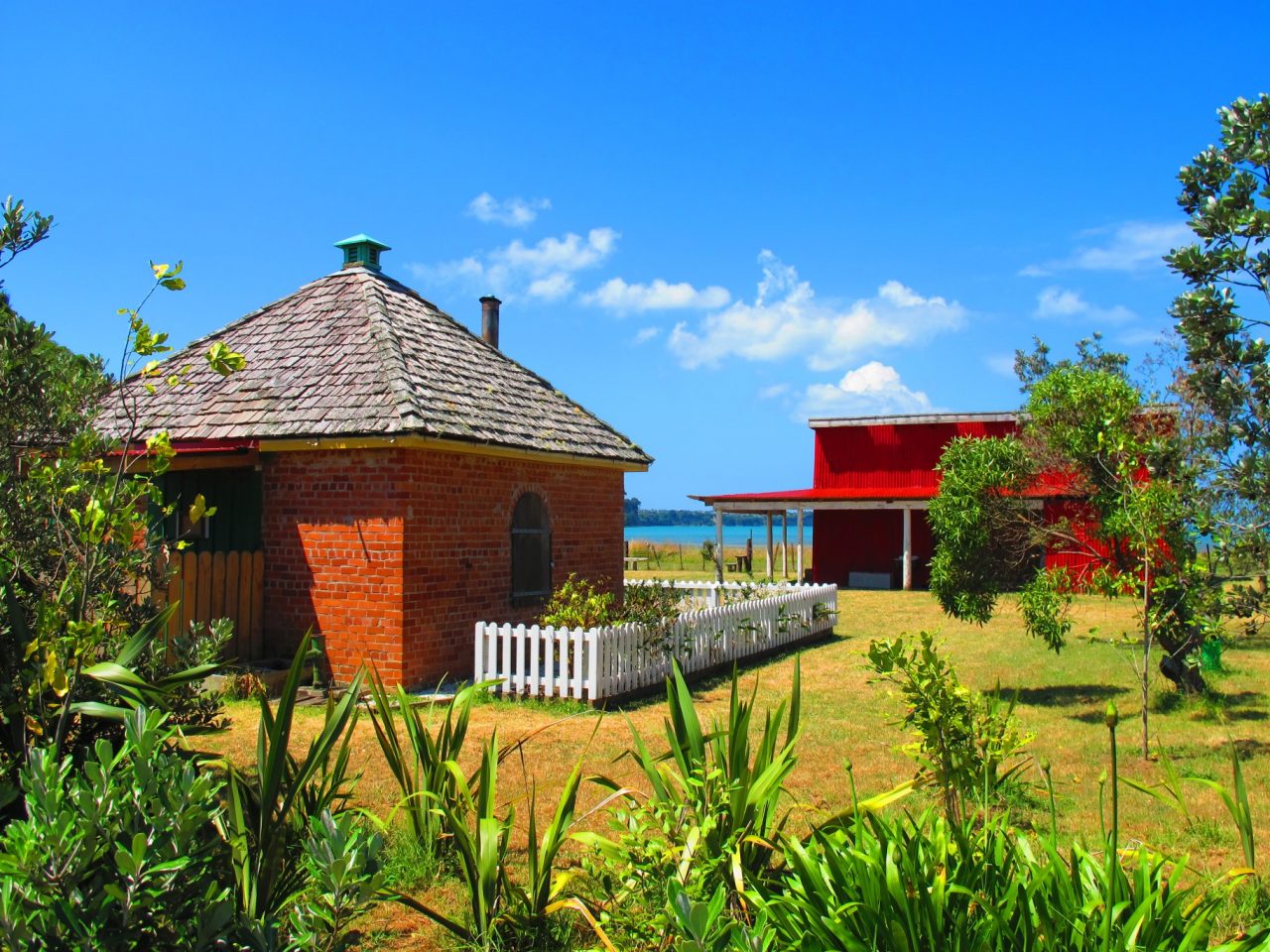 Dacre Cottage is a tiny brick homestead dating back to around 1855. It was built by the son of retired sea captain Ranulf Dacre who bought the 8000ha Weiti block in 1848. The cottage was restored in 1984. Neighbouring it is a rather colourful red barn. It’s the perfect spot for a picnic, next to a sandy beach.