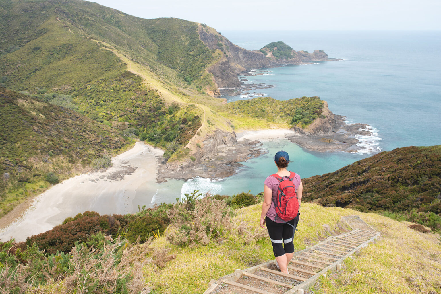 From the beach, it’s a steady and exposed climb, with over-the-shoulder views of a unique angle of Cape Reinga. The track continues east through windswept mānuka bush offering dizzying views down steep clifftops, before descending to Tapotupotu. This north-facing gem offers safer swimming and a DOC campground, though mosquitoes seem compelled to keep this paradise pristine.