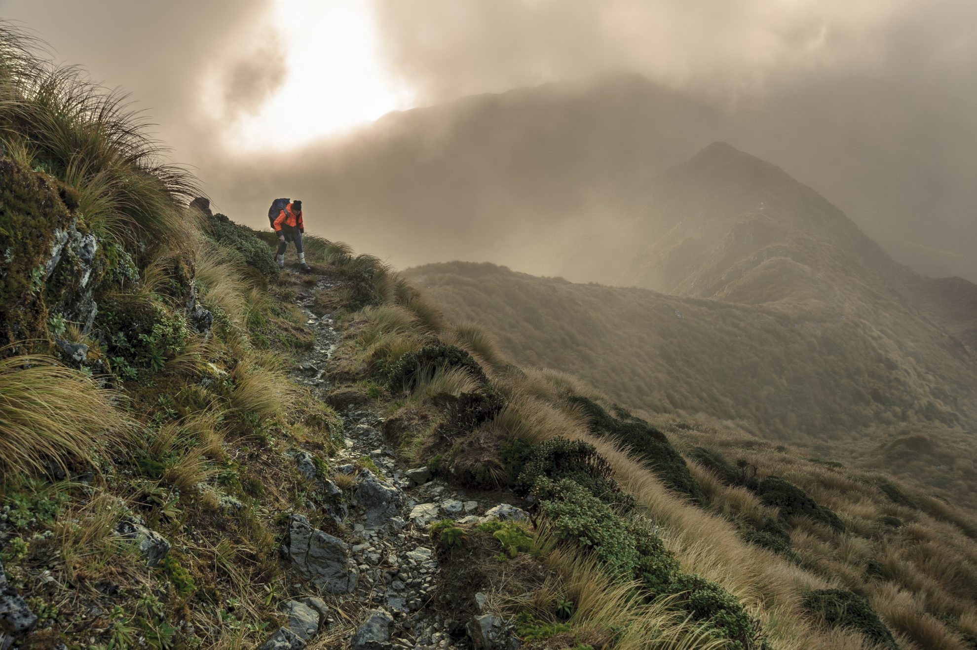 Beyond Field, the track climbs to merge into the tussocklands and undulating terrain of the aptly named Table Top. A boardwalk crosses boggy terrain, and views open up of the range stretching north and south.