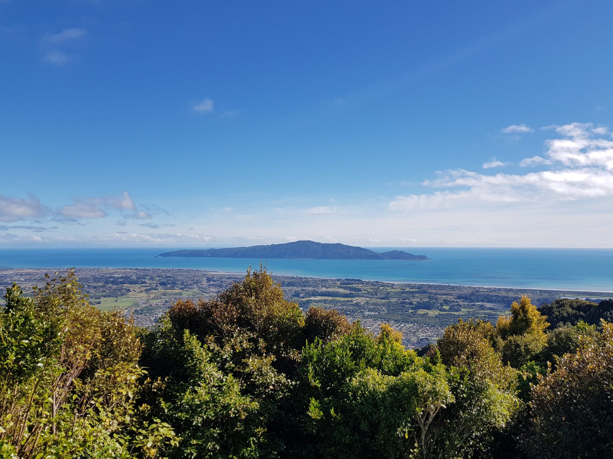 After an hour or so from the top of the climb, a lookout point, surrounded by a ‘hedge’ of shrubby trees, is reached. There’s a wooden bench here – a good spot to have lunch. The tall people in our group got a great view, looking straight out at Kapiti Island.