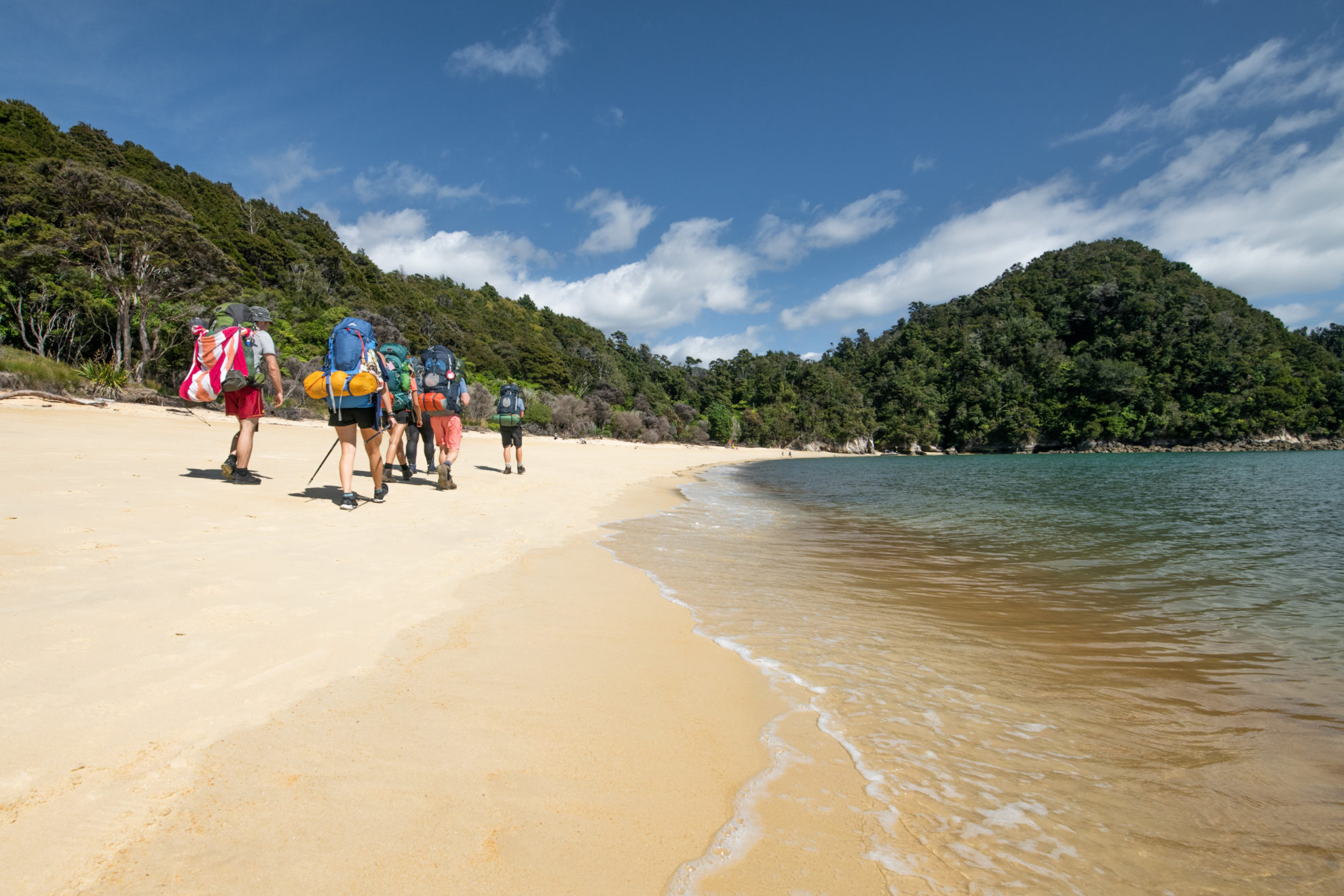 The walk begins with a boardwalk across the estuary and then weaves in and out of gullies above numerous bays and coves. It’s easy-going with the chance to drop into many golden sand beaches on the way. The track turns inland at Akersten Bay and climbs over the headland to reach 34-bunk Anchorage Hut. There are eight campsites on this section.
