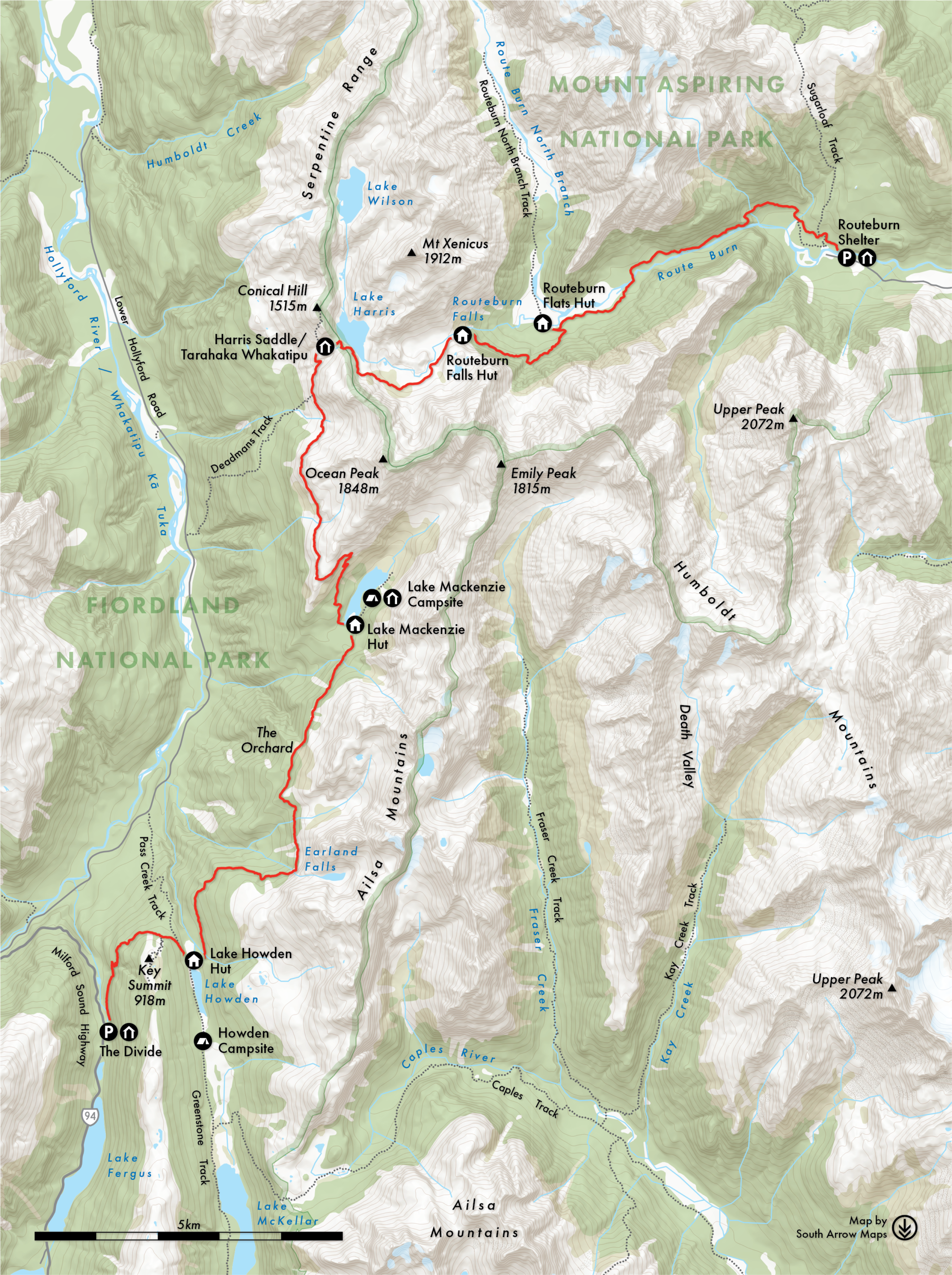 The track continues alongside the Route Burn Left Branch through a spectacular hanging valley. A steep ascent takes walkers high above Lake Harris, which is sidled past on the way to Harris Saddle and shelter with views across the Hollyford River to the Darran Mountains. The track crosses from Otago to Southland here, and the descent begins – first above the treeline and then into rich beech forest before dropping finally to Lake Mackenzie Hut.