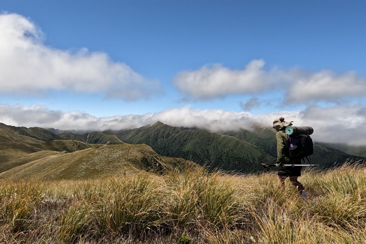 Follow the poled route east along the open tussock spur that climbs towards the ridgeline of the range, about 3km away. Most of the way from here is exposed and would be challenging in bad weather.