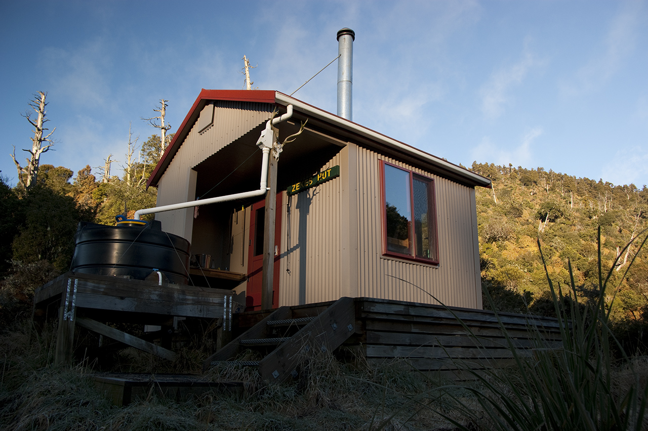 Built in 2007, the hut takes its name from Turangi hunter Zeke Martin. A wood stove makes it cosy during cool autumn nights.