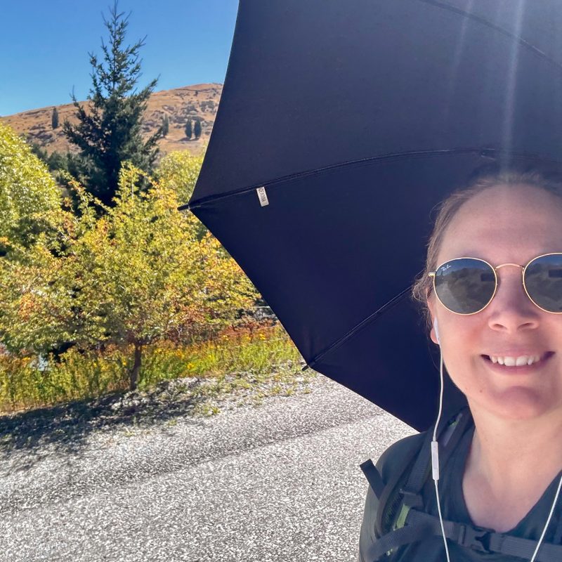 The best thing about the umbrella was the comfort it provided on some of the longest, hottest days I’ve experienced tramping. And it’s hands-free. You can buy clips and cords that attach it to your pack straps, but I just poked the handle under my sternum strap and let it rest on the top of my pack. On windier days I attached the cord to my waist belt to keep it upright.