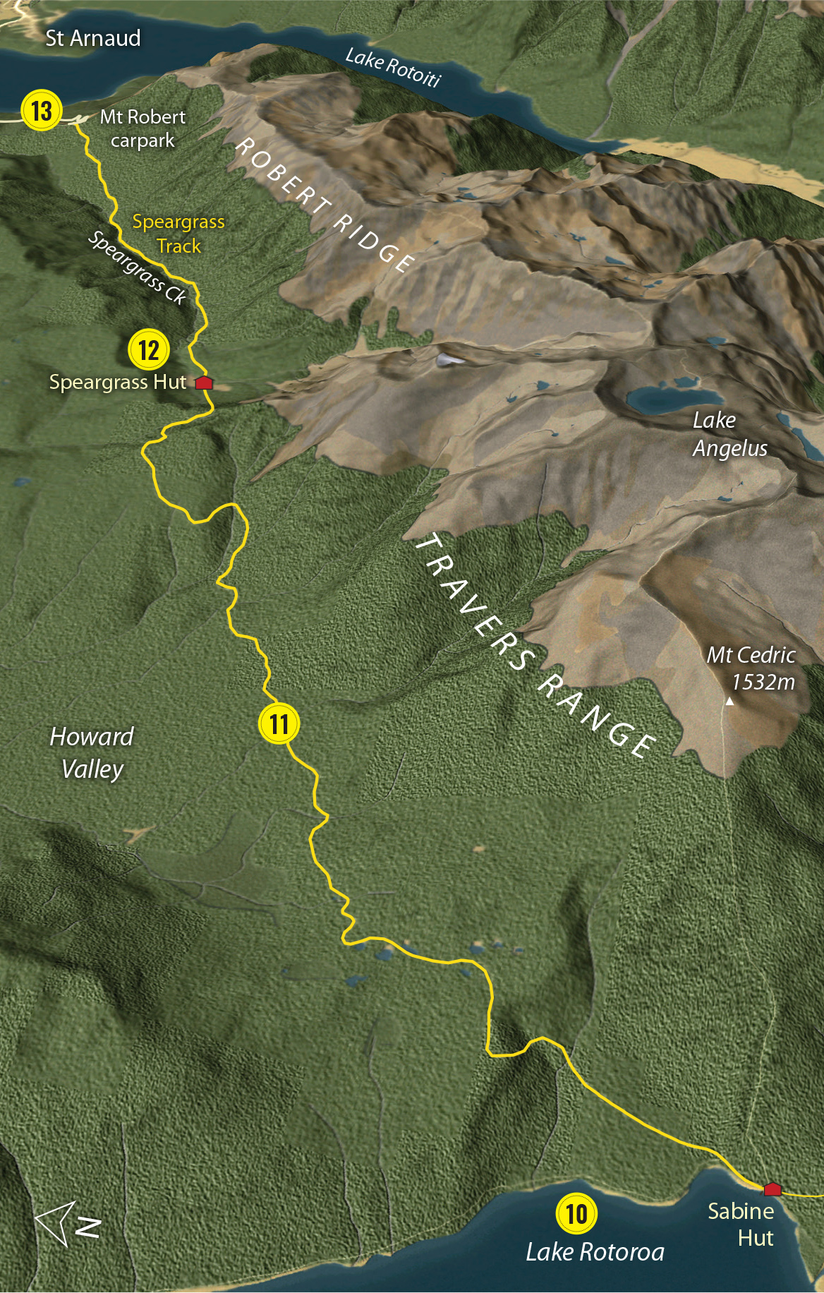 For a finale, the route out over the last two days traverses the Great Alpine Fault, which here runs from the head of Lake Rotoroa, along the floor of the Speargrass Valley.