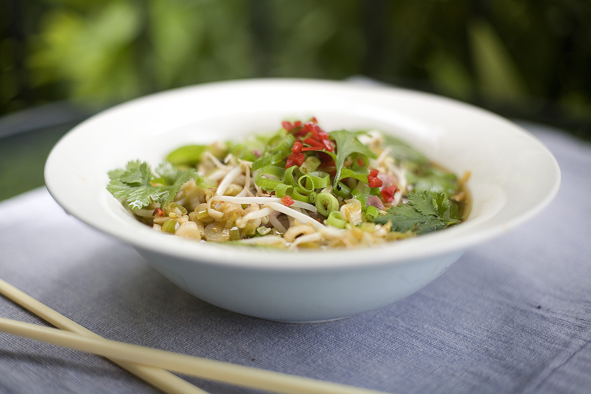 Put the drained noodles in a bowl, add bean sprouts, coriander, basil and mint leaves place the strips of beef on top then pour the boiling broth over the top. Add extra chilli to taste and serve.
