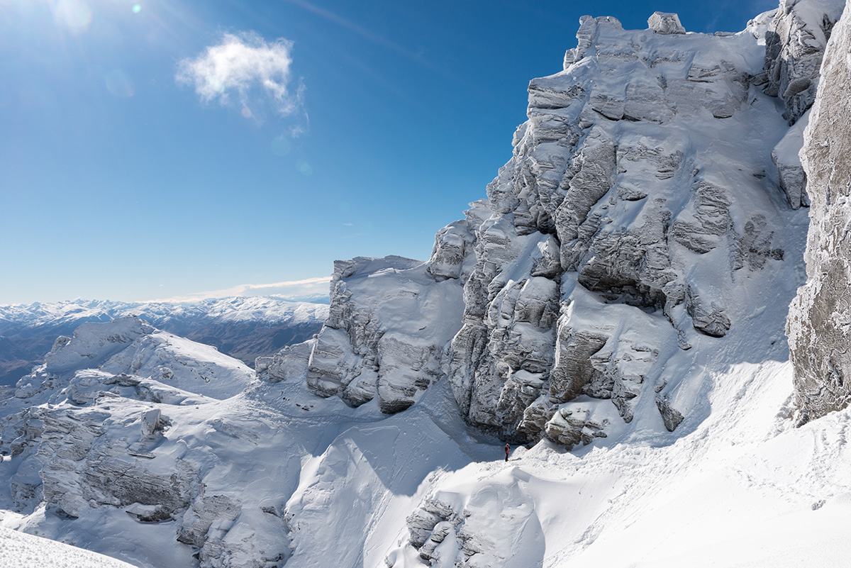 High above Queenstown’s Lake Wakatipu in the Remarkables, Queen’s Drive is the spectacular approach to New Zealand’s best mixed ice and rock climbing. The snow traverse is a steep ramp that stretches from under the snowed up schist crags of Telecom Tower all the way to the West Face of Double Cone. It’s a giddy balcony accessed from Shadow Basin high on the Remarkables ski field with stunning views of Mt Aspiring and Mt Earnslaw.