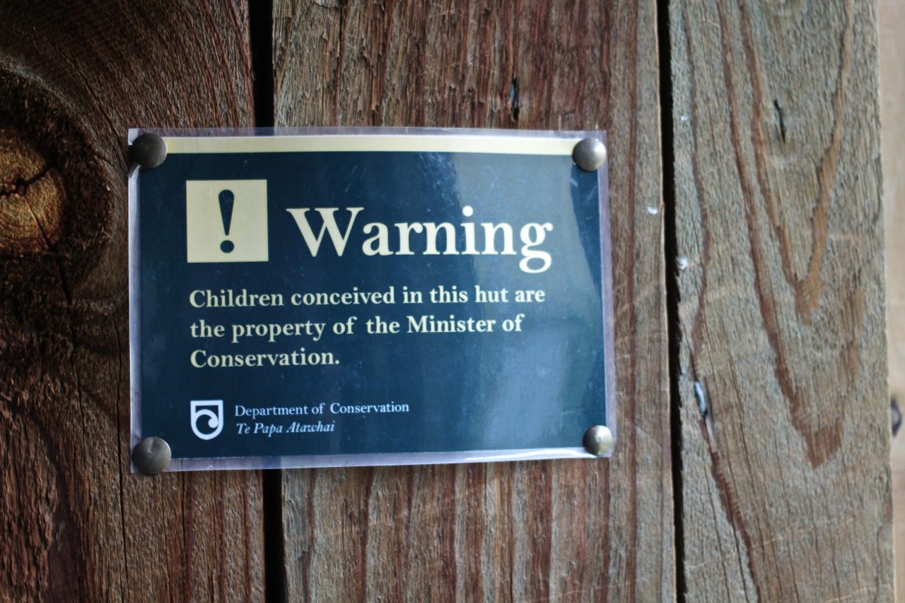 The latest bogus sign to be discovered was seen at Bullendale Hut in the Mount Aurum Recreation Reserve near Queenstown. It reads: ‘Warning! Children conceived in this hut are the property of the Minister of Conservation’.