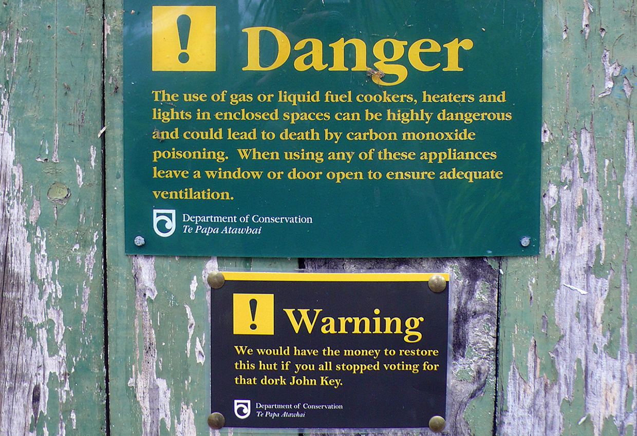 The last bogus sign Morris saw was at French Ridge Hut. It stated: ‘Humourless warning signs may decrease your enjoyment of the backcountry.’