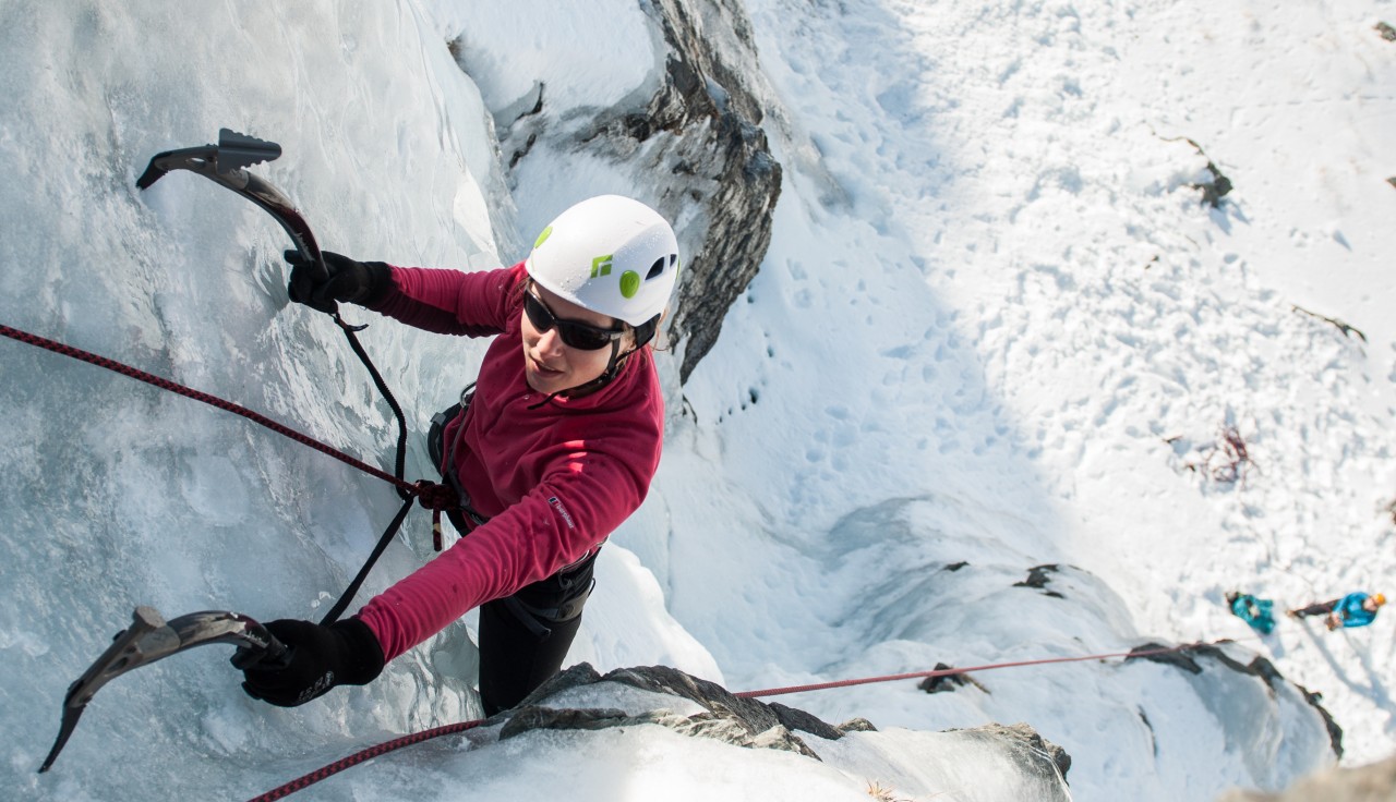 Marta Scott top-roping at Wye Creek during the Remarkables Ice and Mixed Climbing Festival. The festival saw 115 climbers gather in Queenstown competing for awards and taking part in climbing courses. Marta was one of eight climbers attending the two day Adventure Consultants’ women only Chicks ‘n’ Picks ice climbing clinic.