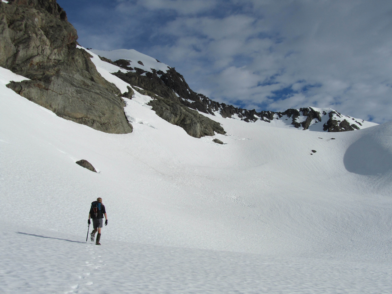 Following the route guide, we made our crossing to the west of Pt1845, below Mt Armstrong Glacier, rather than across the actual col itself. We were rewarded with a breathtaking view of snow-capped peaks poking their heads out of the fog–shrouded valley. With the view came a feeling of trepidation, as we knew our route out involved descending into that same fog.
