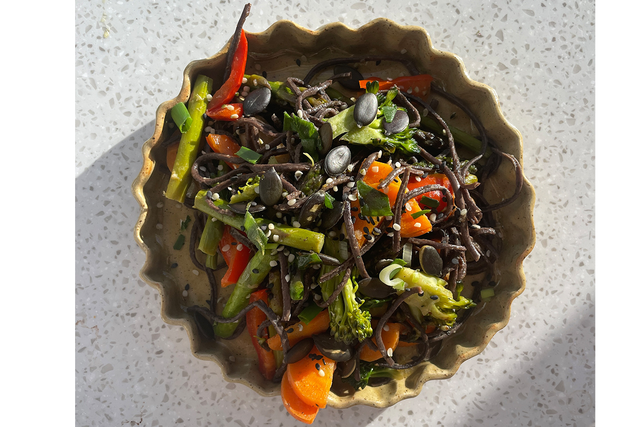 Tip in the noodles and cook as per the packet instructions. Chop vegetables into matchsticks or desired shape and add to the pot when there is no more than two minutes remaining on the timer. Drain the water out when the noodles are done, then mix through the pre-prepared dressing. Divide between four bowls and garnish with the spring onion and seeds.