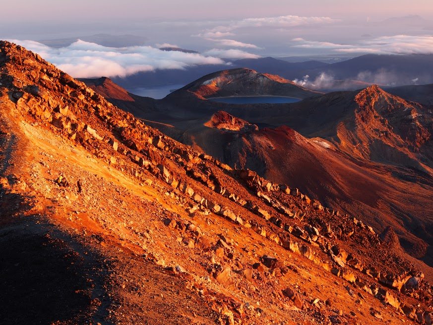 The intense morning light paints the barren volcanic landscape in fiery red, highlighting the scars from its explosive past. Such surreal and otherworldly experience is the reward to anyone who sacrifices sleep and makes the predawn ascent of Mt Ngauruhoe.