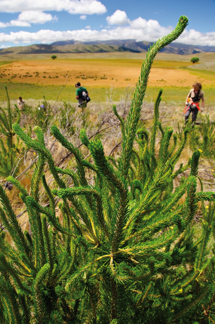 Our first day as volunteer pine loppers is at Killermont Station on private farmland adjacent to a DOC reserve. “At Killermont we’re helping the farmer get rid of some of his wilding problem in order to protect the conservation land,” says Paul. Farmers, DOC, Environment Canterbury and local conservation trusts work collaboratively on control. Adds Paul: “Wilding pines reduce farming and pastureland, so [farmers] are on the same side as we are on this, that’s why the collaborative [approach] is so fruitful.”