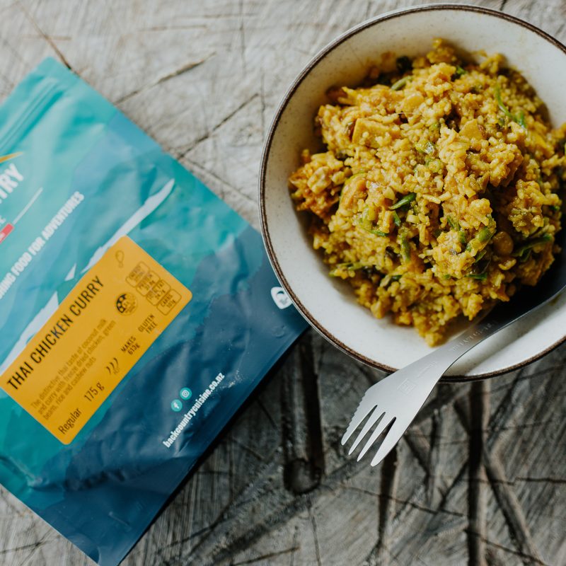 Enjoy the distinctive Thai taste of coconut milk and curry with freeze-dried chicken, green beans, rice and cashew nuts. Gluten free. www.backcountrycuisine.co.nz