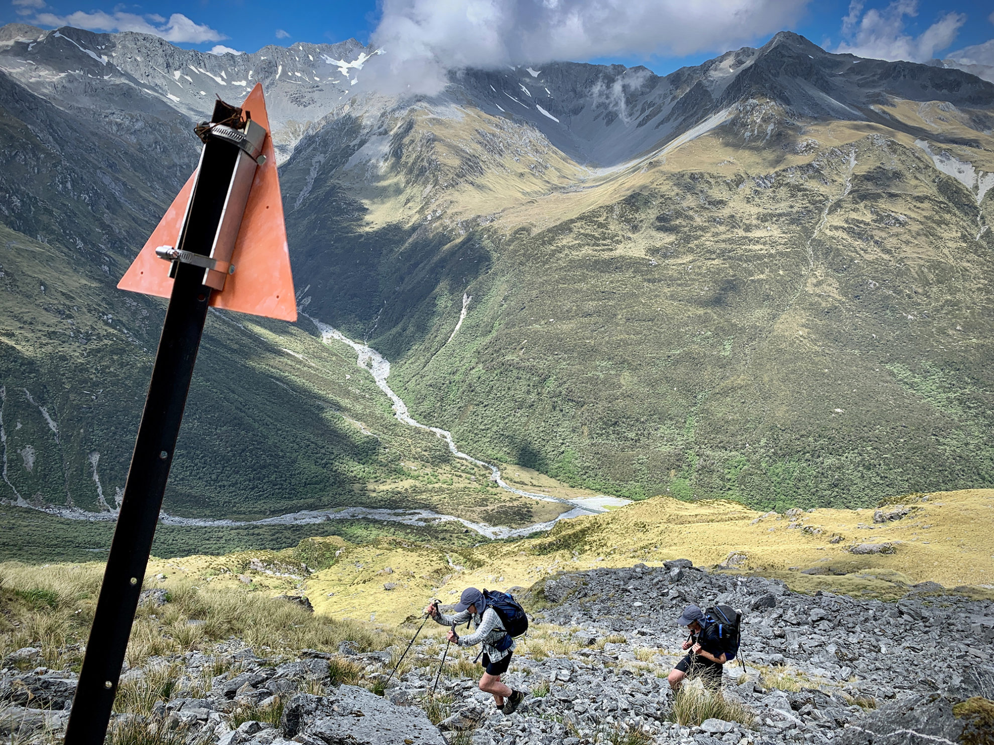 It took a couple of hours to reach Top Crawford Hut. This was another welcome respite from the heat, with a prime view of our work for the rest of the morning – an 800m climb to Lathrop Saddle. We slogged on through a scrub-covered gut and over bluffs before topping out on a small terrace. A few poles marked the route which sidles up and across steep scree slopes to the saddle. This was an honest morning’s labour.