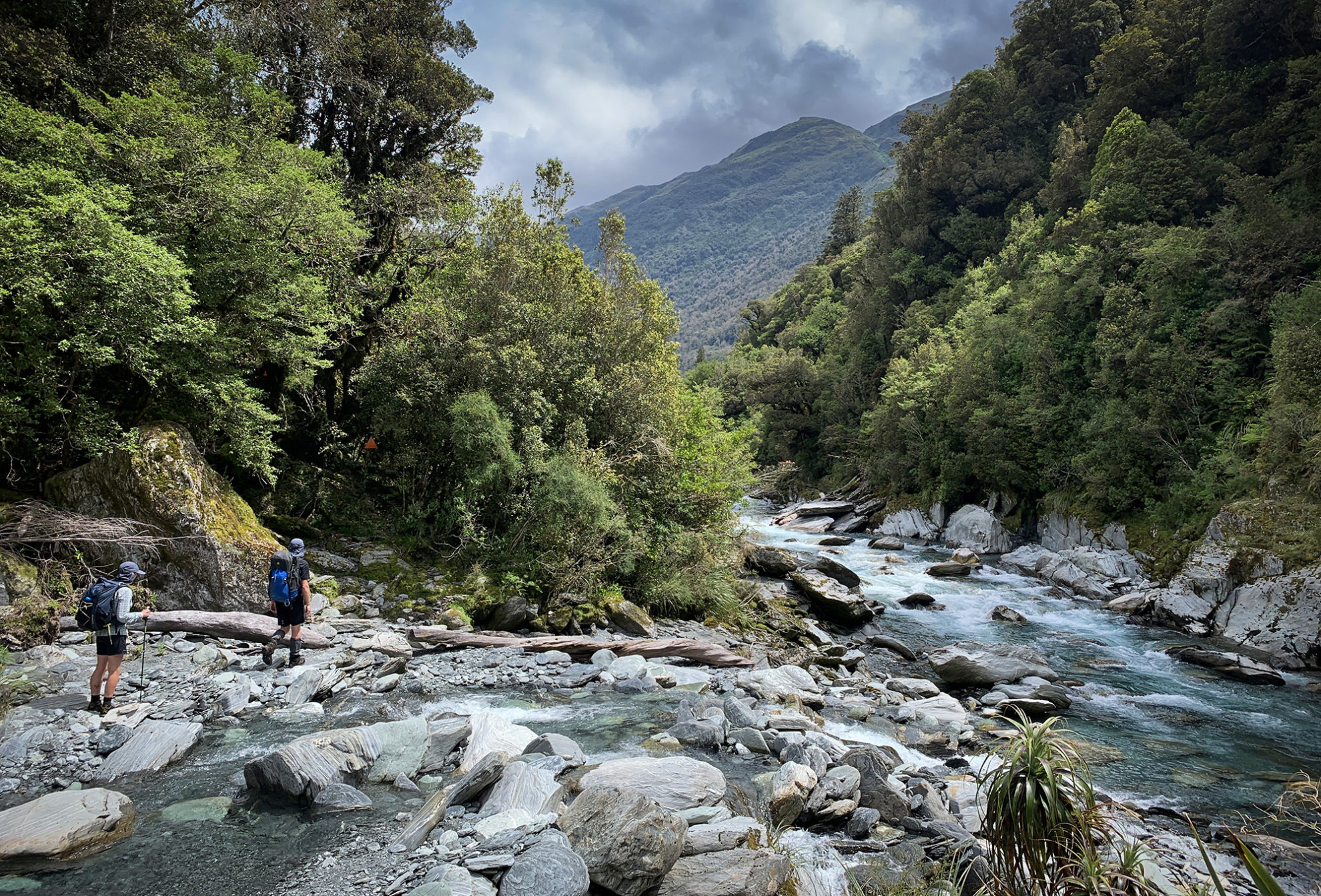 After morning tea, the delightful river travel soon lost its novelty. The boulders were bigger, the crossings deeper and more frequent. It hadn’t rained on the Coast for a few days, but care was still needed while crossing. This was turning into a typical slog down a wild West Coast River. Markings were infrequent with sometimes a triangle indicating that we should enter the bush with slippery sidles on rough tracks around spurs, over rocks and through dense vegetation. All the time the Kokatahi roared deafeningly. This was gorgeous country but hard work. We mimed through lunch, the river drowning conversation.