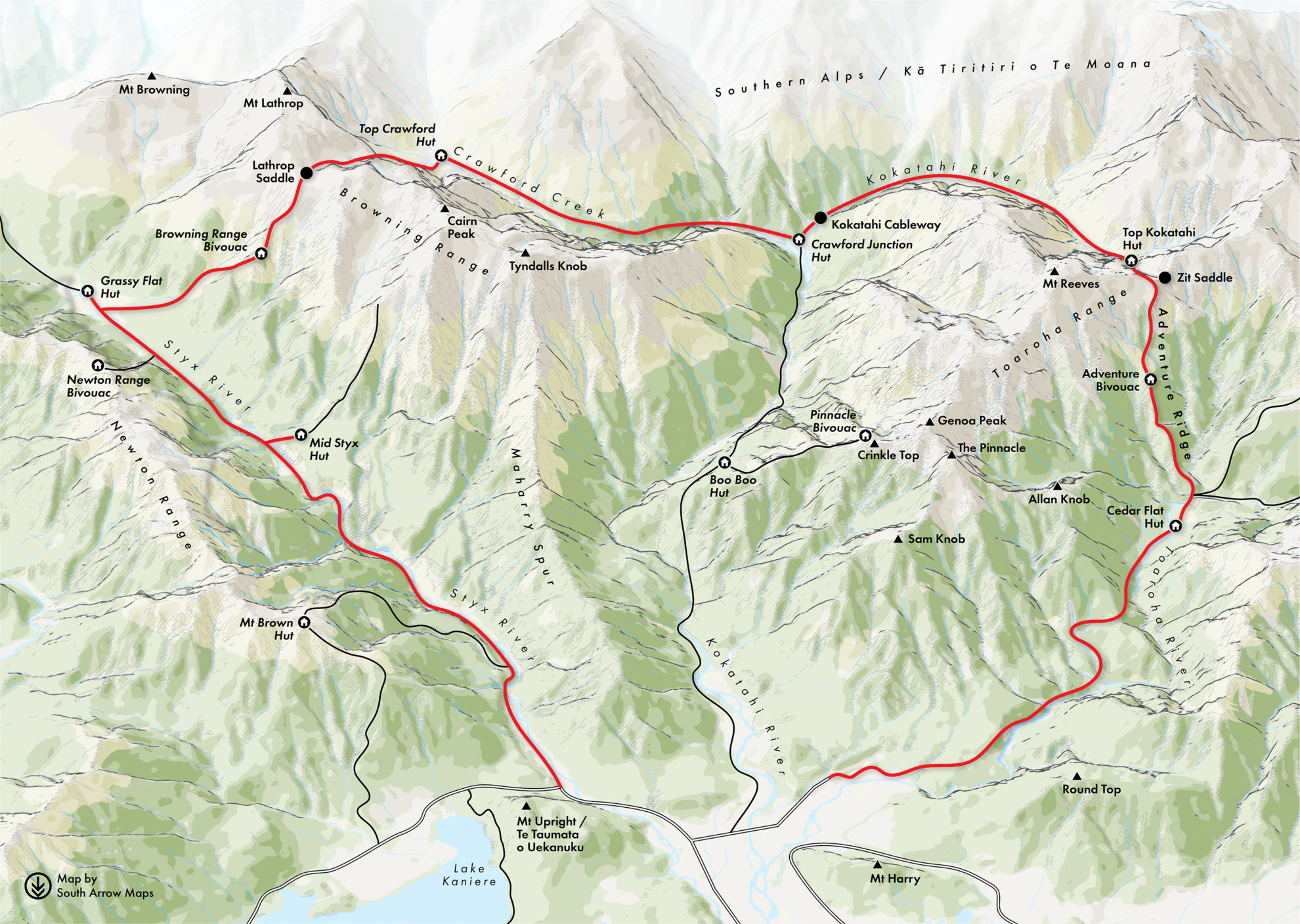 4-5 days. Car park to Adventure Bivouac, 5.5hr; To Top Kokatahi Hut, 3hr; To Crawford Junction Hut, 5hr; To Top Crawford Hut, 3.5hr; To Browning Range Bivouac, 4hr; To Grassy Flat Hut, 2hr; To road end, 6hr