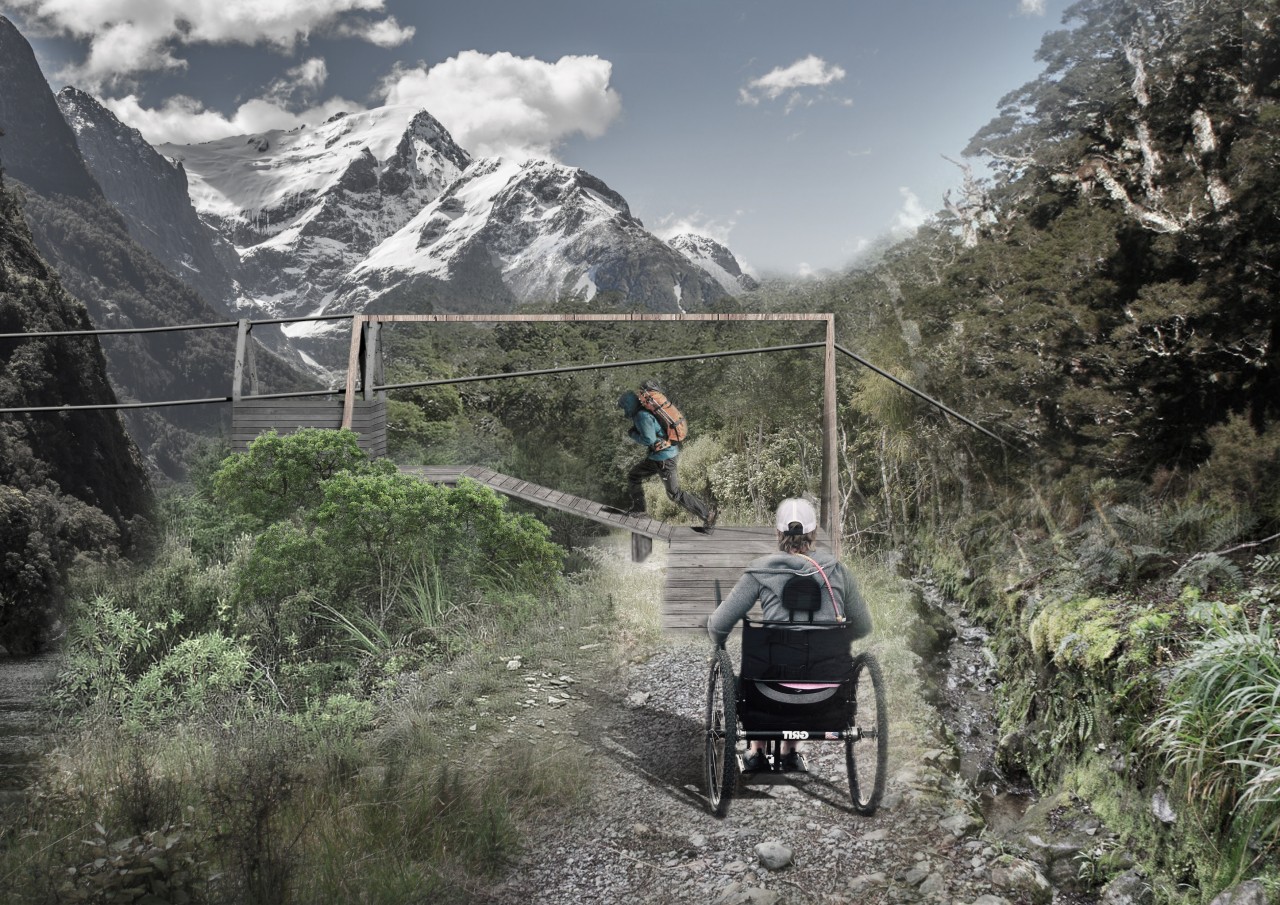 Consulting wheelchair access advocacy groups such as the Halberg Disability Sport Foundation, McKone designed a proposal which involves a series of interventions that would allow wheelchair users to complete the 56km, multi-day track. While it would be impossible to eliminate inclines and declines, the design would cut switchbacks into steeper sections, using a cable system to help users move up and down the track using a body harness and carabiners. The track around Little Homer Saddle would be extended, avoiding steeper gradients, which McKone said could also showcase the wilderness more.