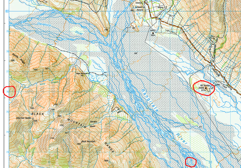 On the Topo50 maps there is a series of evenly spaced horizontal and vertical lines called ‘eastings’ and ‘northings’. These grid lines divide the map into a set of numbered 1km squares. At a scale of 1:50,000, each square is 2cm by 2cm and the numbers increase from west to east and from south to north.